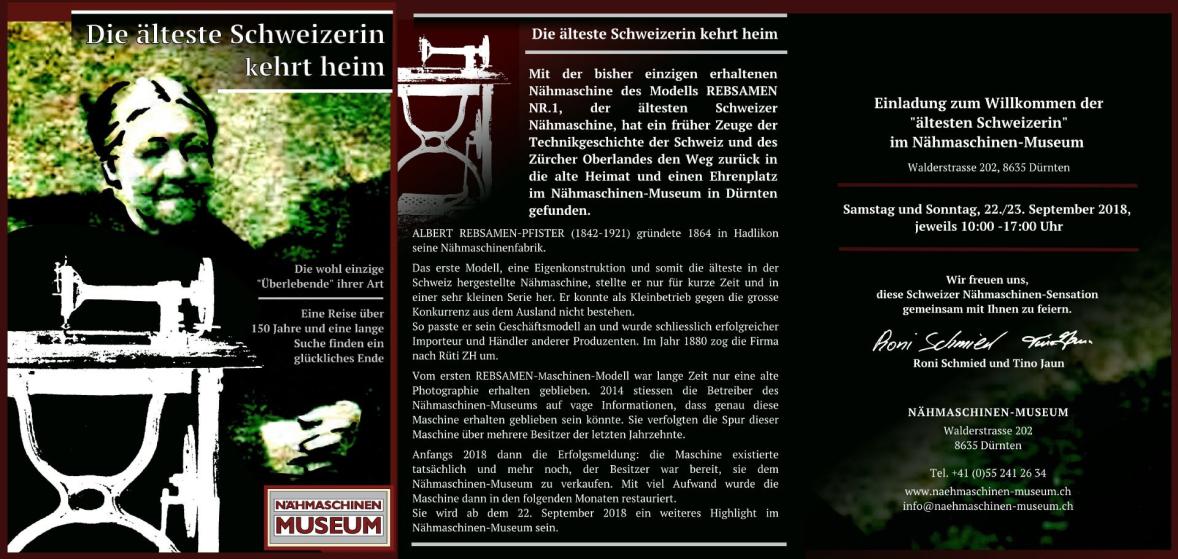Mit der bisher einzigen erhaltenen Nähmaschine des Modells REBSAMEN NR.1, einer der ältesten Schweizer Nähmaschinen, hat ein früher Zeuge der Technikgeschichte der Schweiz und des Zürcher Oberlandes den Weg zurück in die alte Heimat und einen Ehrenplatz im Nähmaschinen-Museum in Dürnten gefunden.