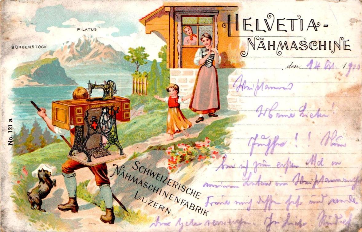 Eine wunderschöne Postkarte der "Schweizerischen Nähmaschinen-Fabrik, Luzern, HELVETIA" aus dem Jahr 1910, die - natürlich überhaupt nicht romantisierend - die Lieferung von Nähmaschinen in die schönen Schweizer Berge darstellt. Es fehlt bloss noch die akustische Untermalung mit einem Jodel.